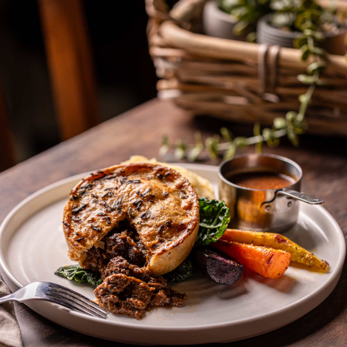 Wild mushroom bourguignon pie, roast potatoes, seasonal greens, roasted roots, gravy (ve) | 18.5 1049 kcals