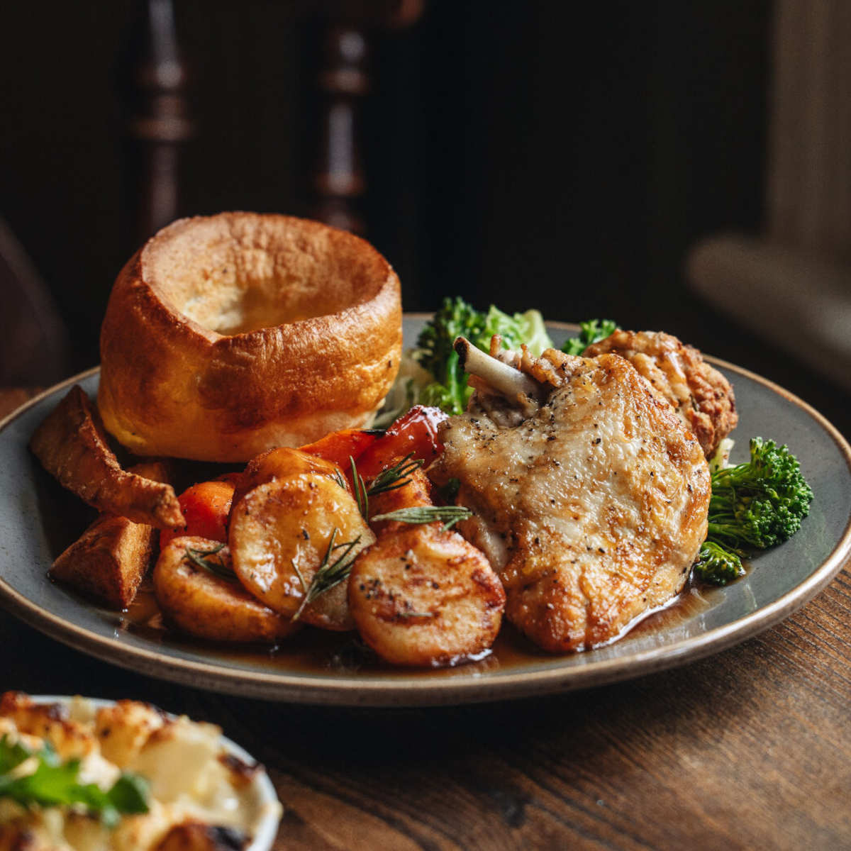 All served with roast potatoes, seasonal greens, roasted roots,Yorkshire pudding, beef dripping gravy